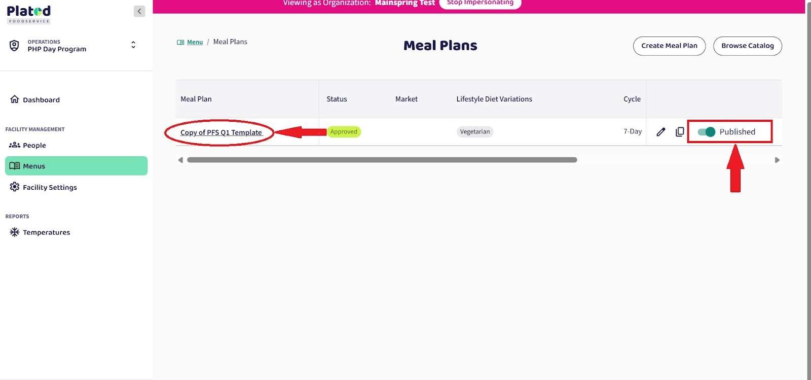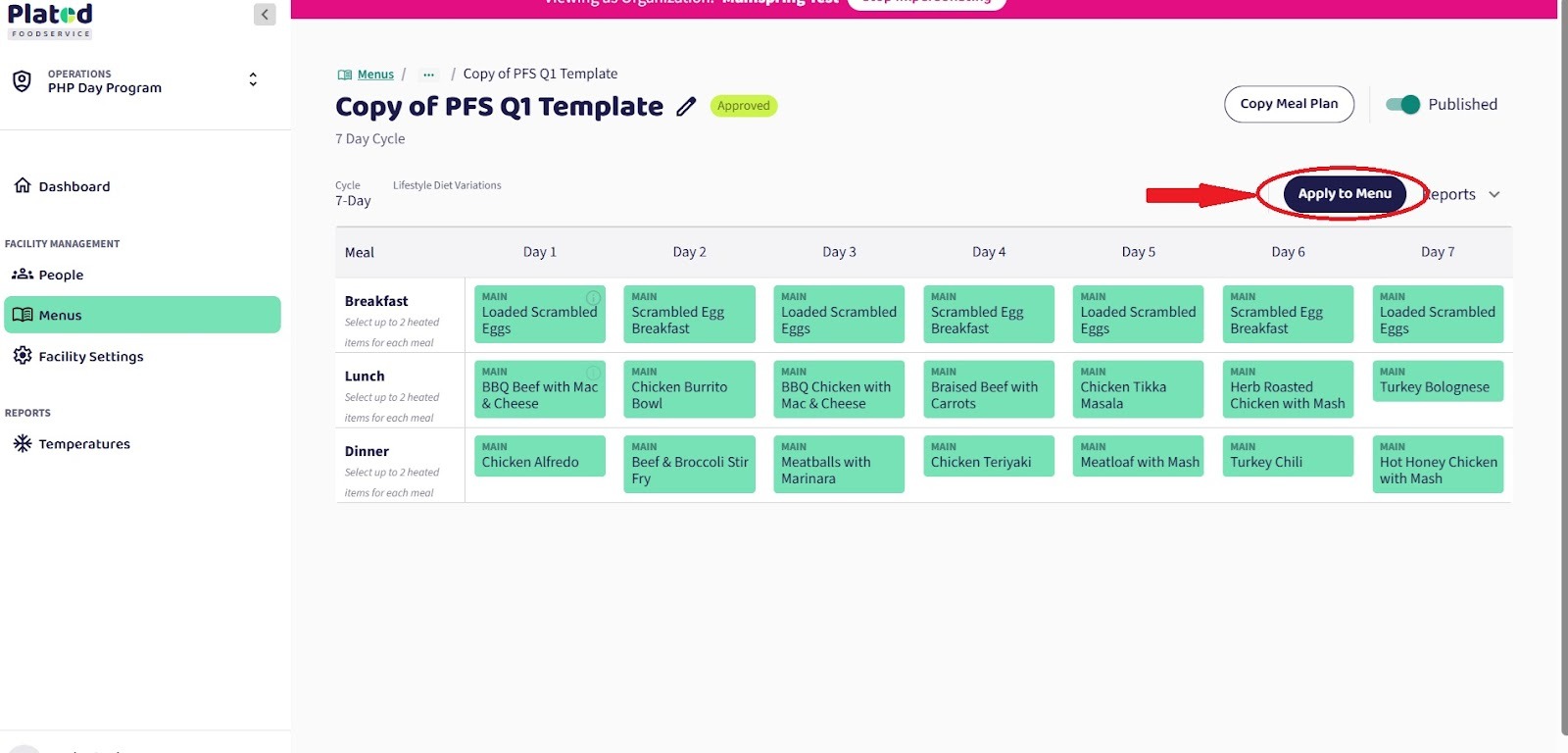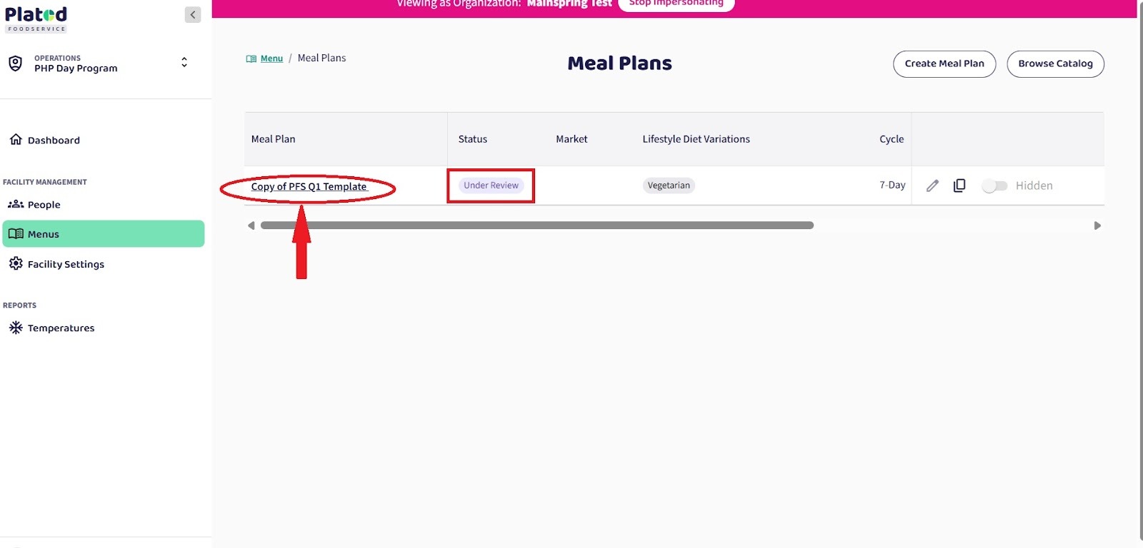 - Return to the Meal Plans list by clicking "Menus" in the navigation