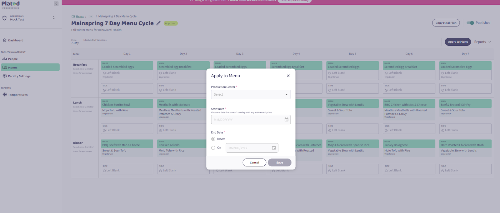 Important: Publishing makes the menu visible and available to apply to your production center, but it does NOT make it active yet.