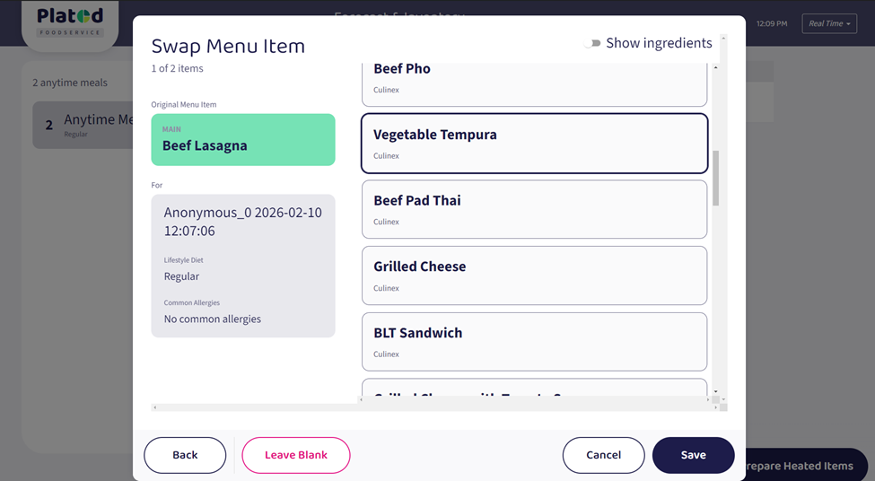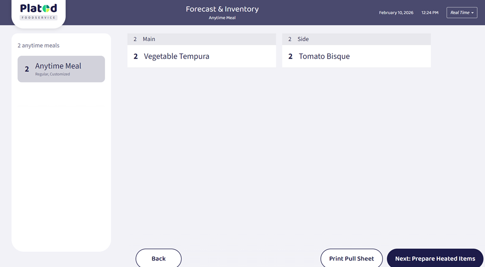 Example: If you're preparing lunch, select "Lunch" - the system will show lunch entrees and sides