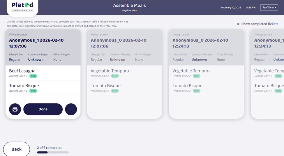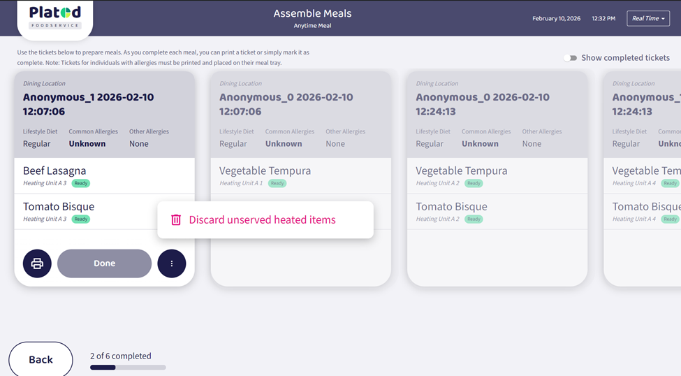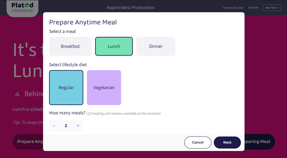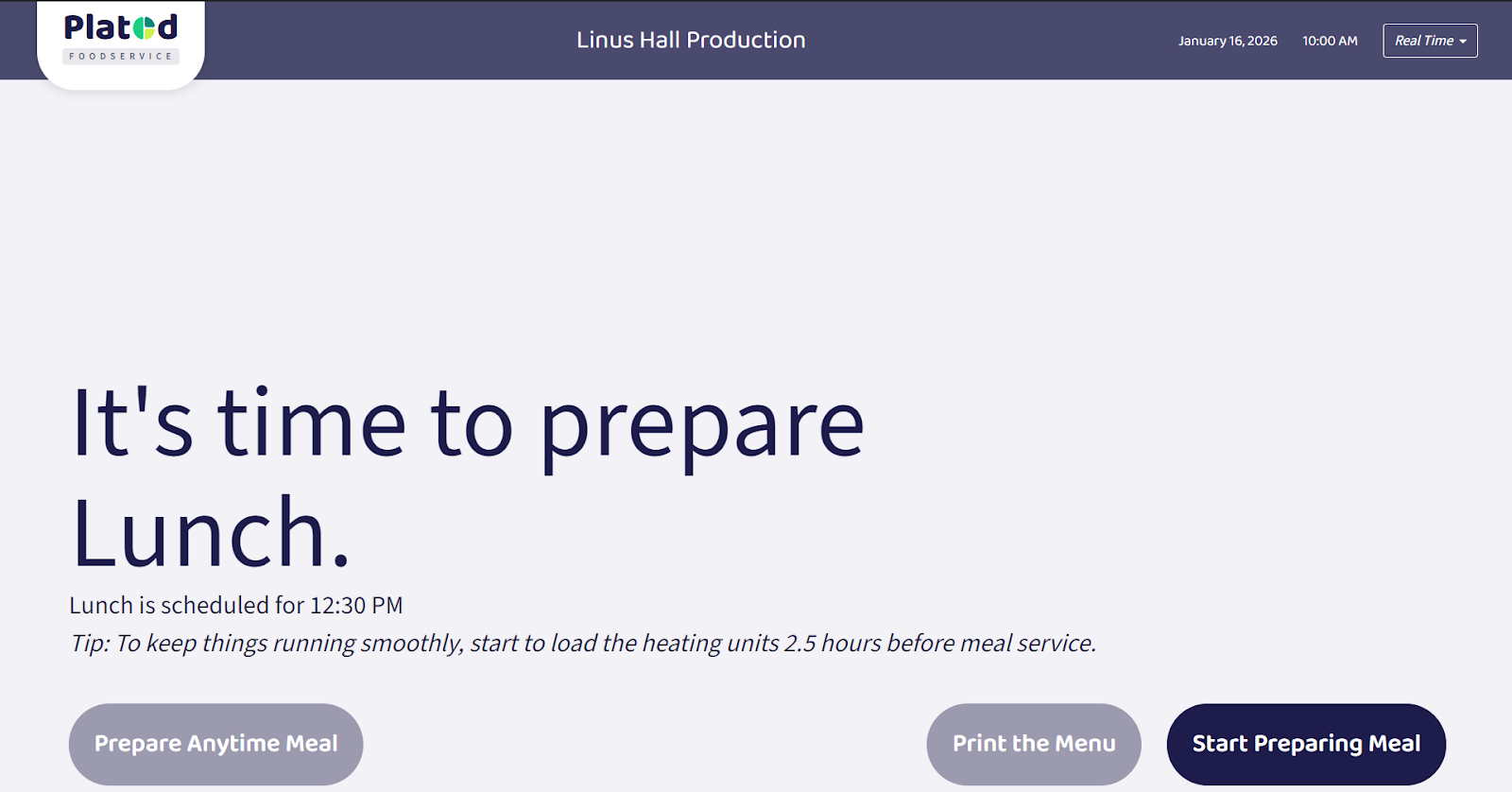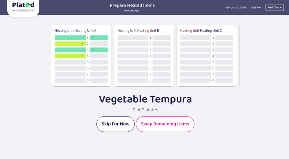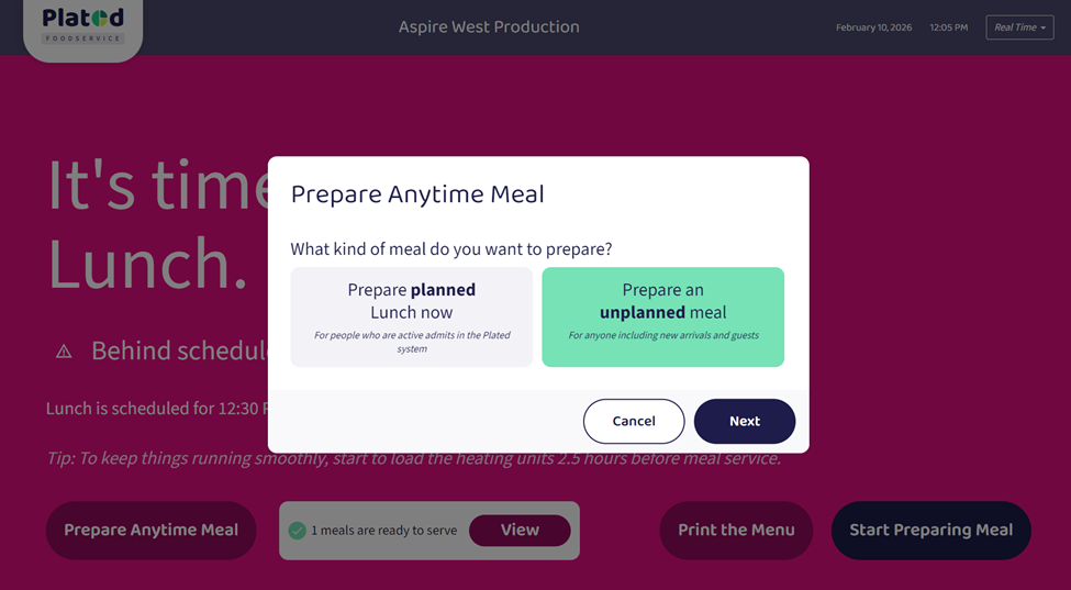 Anytime Meals support early service of planned meals for admitted people as well as unplanned meals served outside of your regular meal schedule for people not registered in the system (like a guest meal). This guide covers the complete process of preparing and serving Anytime Meals for people not admitted in your system using the Plated terminal and heating appliance. A separate guide is available for service of Anytime Meals to admitted individuals.