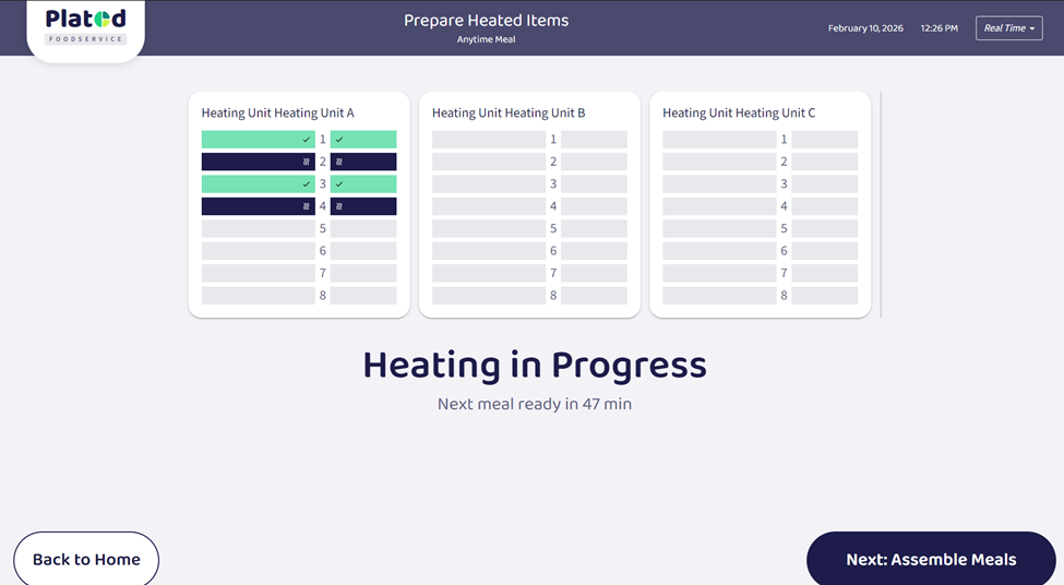 "Next: Assemble Meals": Advance to serving (only active when heating complete)