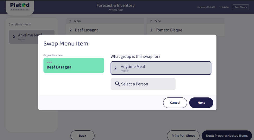 Unplanned meals may be edited using the Item Swap feature on the Forecast & Inventory screen